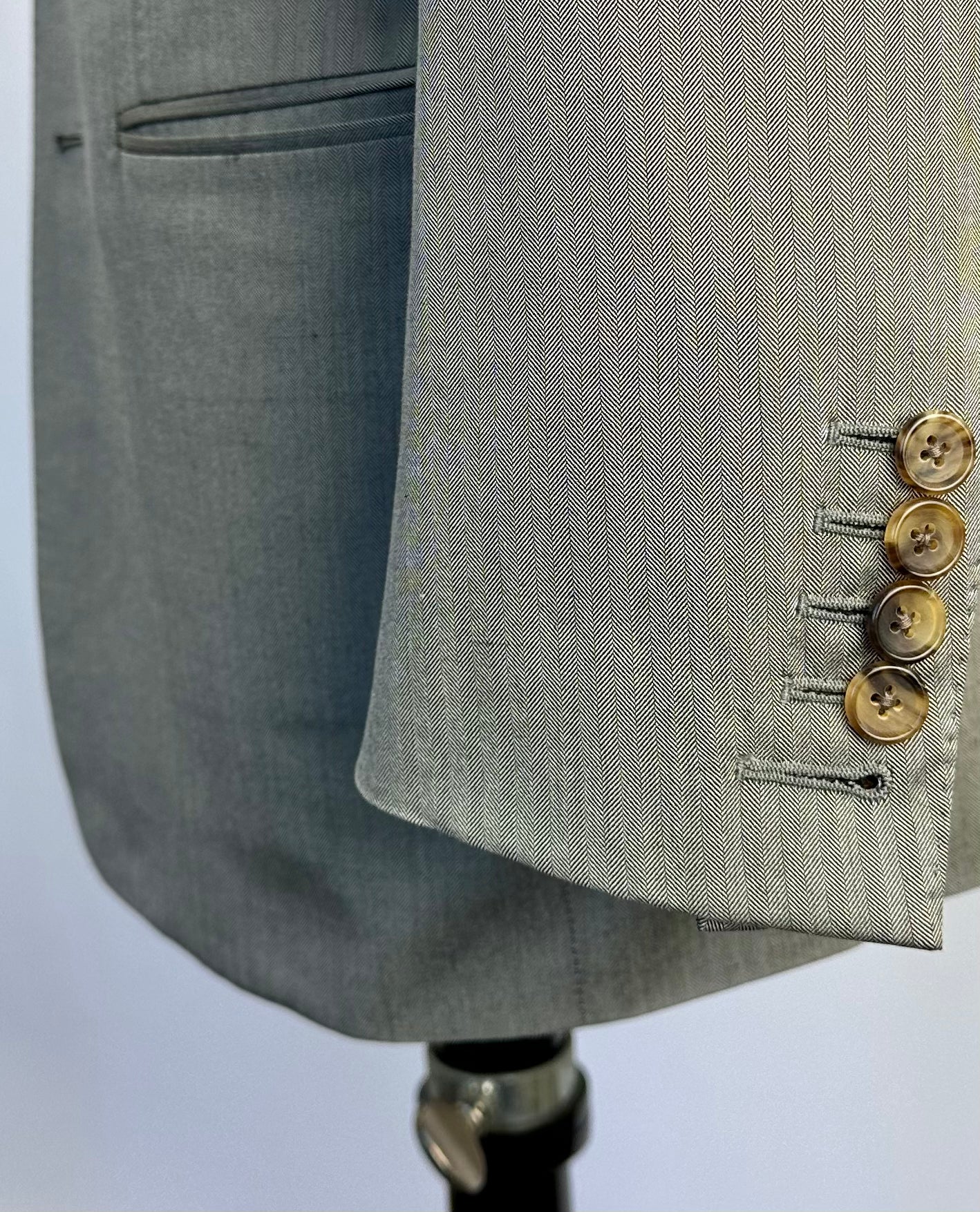 5 functioning horn buttons at the end of the sleeve, with a larger 5th button opening - a quintessential Tom Ford Detail. Even this step, apparently the simplest, is treated with an abundance of detail. Attaching the buttons is a job that requires patience and must be completed to perfection.